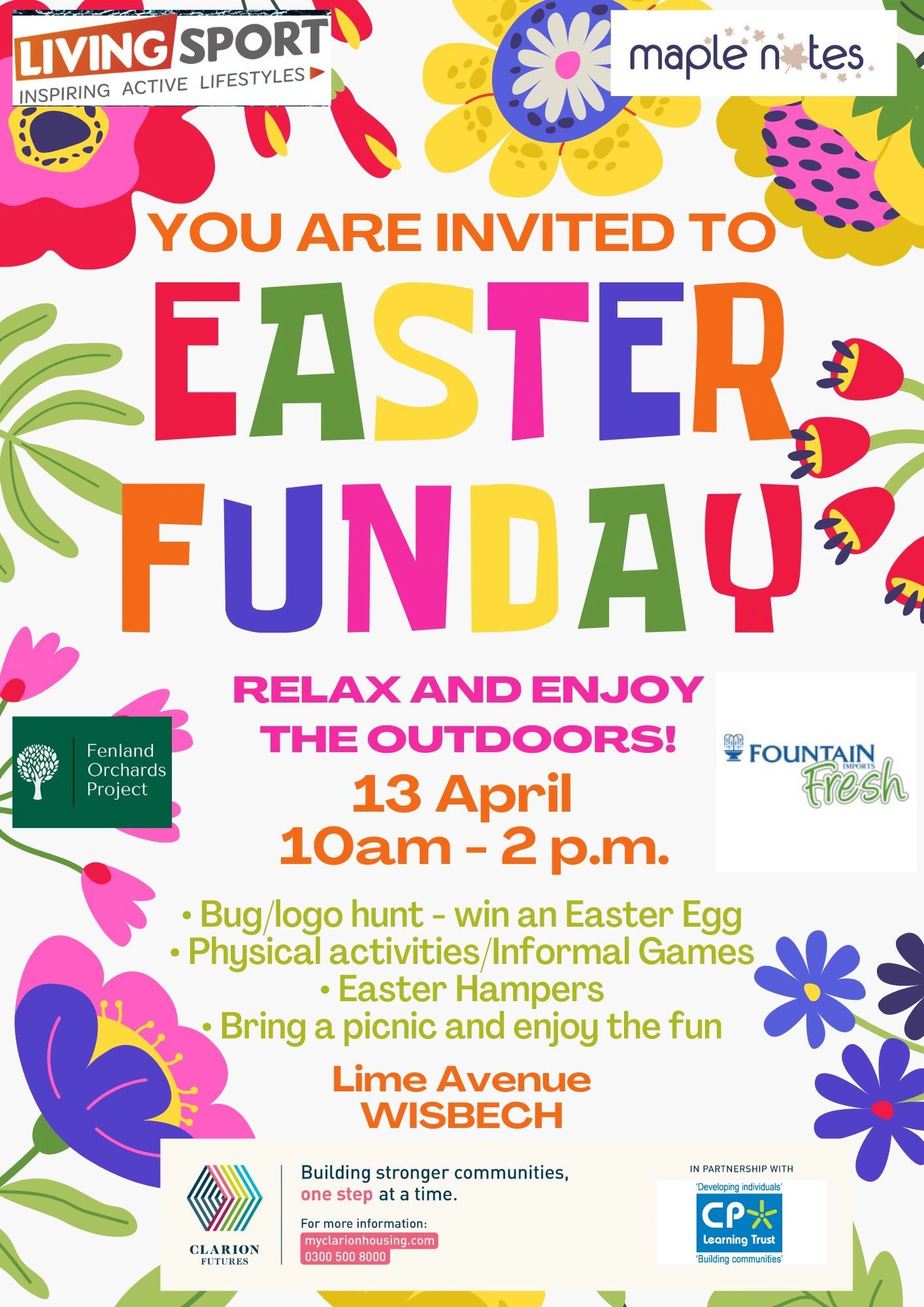 We are really excited to be working with Clarion Housing on the Lime Avenue in Wisbech. To celebrate this we are holding an Easter Funday on Sunday 13th April. There will be a "logo hunt" with an Easter Egg prize. Fun activities with Living Sport and Fountain Fresh will be handing out some goodies.